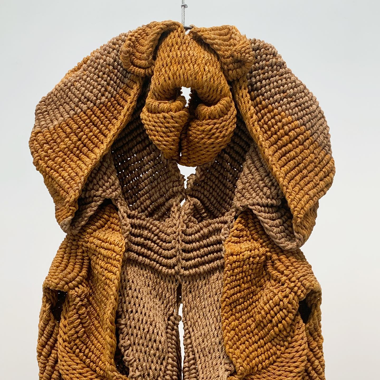 Née de parents artistes dans le Bombay d’après la partition et élevée à Santiniketan, une communauté utopique du Bengale occidental, Mrinalini Mukherjee a travaillé intensivement avec la fibre – et plus tard avec le bronze et la céramique – pendant la majeure partie de sa carrière qui s’étend sur quatre décennies, créant un vaste corpus d’œuvres qui fusionnent l’abstraction et la figuration avec des influences de la nature, de la sculpture indienne ancienne, du design moderne, de l’artisanat local et de la tradition du textile. Dans ses premières œuvres, des tentures murales d’inspiration botanique fabriquées à partir de cordes naturelles au début des années 1970, Mukherjee a expérimenté intuitivement la technique de tissage arabe ancienne du macramé, qu’elle a utilisée tout au long de sa vie, créant des sculptures souples de plus en plus audacieuses et monumentales, qui se dressent telles des divinités. Tout au long des années 1970, Mukherjee a rationalisé sa méthodologie matérielle – un processus artisanal qui impliquait l’acquisition et le tri de lourds paquets de cordes achetés sur les marchés de New Delhi – et a conceptualisé une approche de plus en plus organique de ses formes. Parfois suspendues au plafond, parfois autonomes ou placées contre un mur, les sculptures massives de Mukherjee prennent les caractéristiques du vivant : teintées d’oranges, de jaunes et de violets végétaux, des œuvres voluptueuses comme Rudra, Devi (toutes deux de 1982) et Vanshree (1994), projettent la sensualité humaine, avec des plis et des renflements qui ressemblent étroitement à des organes sexuels.