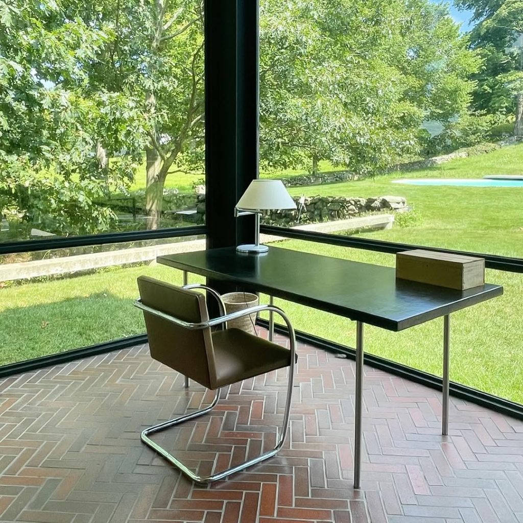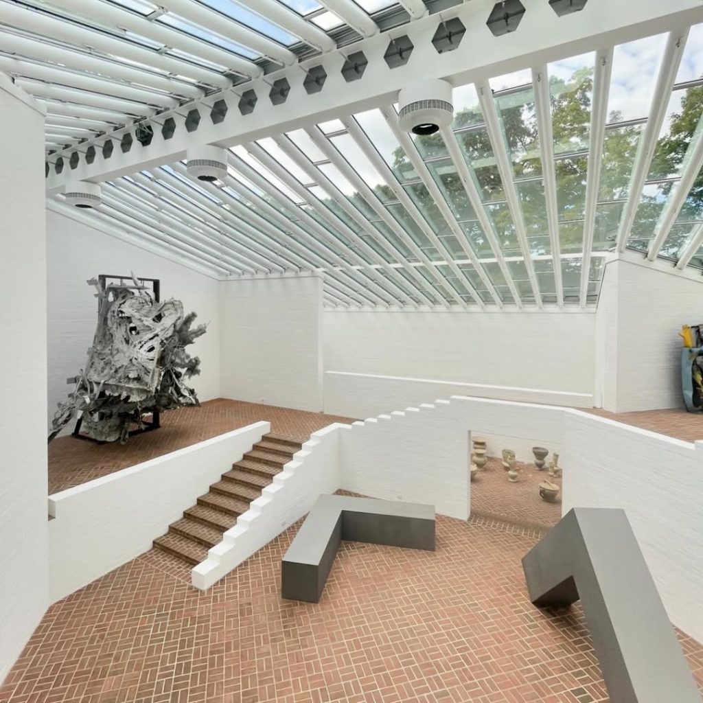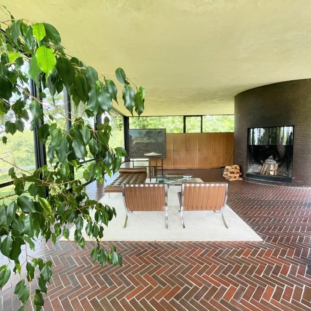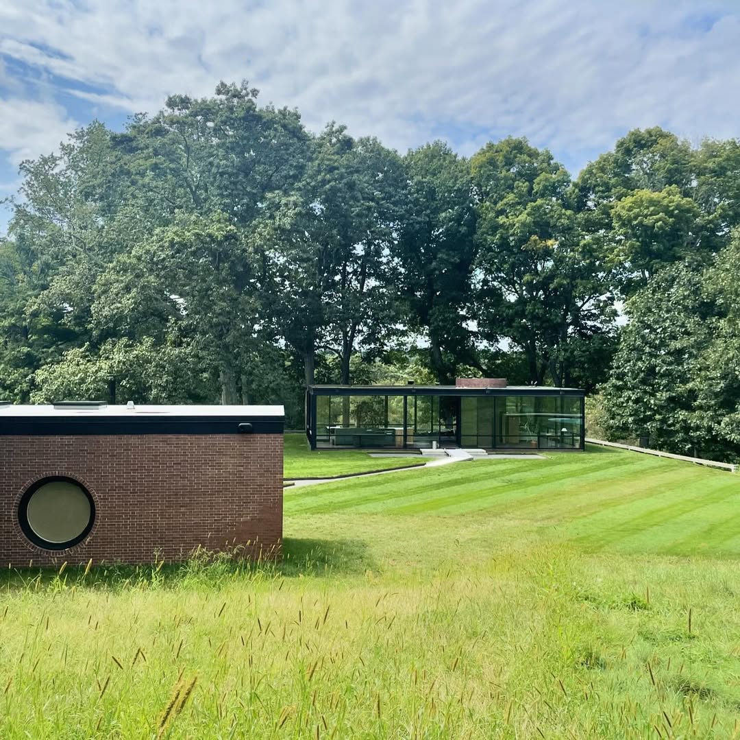 La Glass House (1949) est célèbre pour ses murs transparents qui intègrent la nature dans l’espace de vie. À proximité, le Studio de Johnson offre un espace de travail isolé et propice à la réflexion. La Brick House, une maison d’hôtes solide et fermée, contraste avec l’ouverture de la Glass House. Le domaine comprend deux galeries : la Painting Gallery, dont les murs mobiles présentent des œuvres d’artistes tels que Frank Stella et Andy Warhol, et la Sculpture Gallery, où la lumière naturelle met en valeur des pièces de Michael Heizer et d’autres artistes. Parmi les autres structures, citons Da Monsta, le Pavillon dans l’étang et le Monument à Lincoln Kirstein.